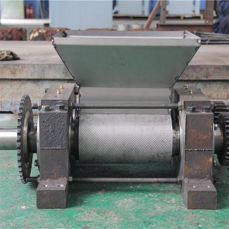 由電動機驅動皮帶和皮帶輪,通過減速機傳遞給主動軸,并通過對開式齒輪與被動軸同步,相向工作。物料從進料斗加入,經(jīng)過輥擠壓成型,脫模造球,并經(jīng)過一副鏈條,傳送到破碎篩工作室,篩下和分離成品顆(球)粒,然后返回料與新料混合,再進行造粒。隨著電動機連續(xù)轉動,物料的不斷進入,方能實現(xiàn)批量生產。